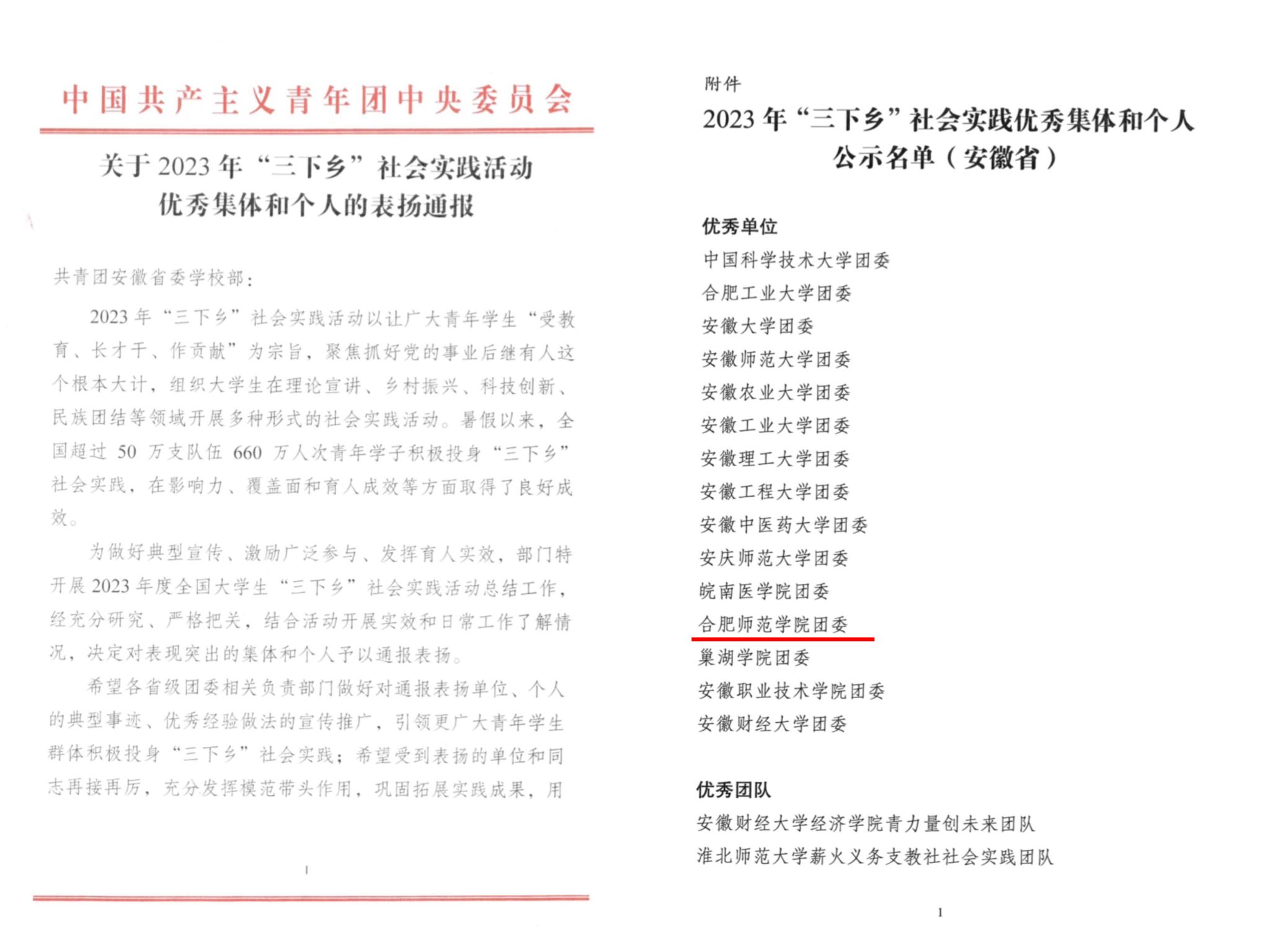 近日,共青团中央印发《关于2023年度全国大中专学生志愿者暑期文化科技卫生“三下乡”社会实践活动的通报》,我院获评2023年全国大中专学生志愿者暑期“三下乡”社会实践活动优秀单位,这是我院连续第五年获得此荣誉。此外,经济与管理学院副教授范敏指导的《庐剧新声:新时代视域下的庐剧发展现状与传承路径探寻——基于1300份问卷调查》获评2023年“三下乡”“返家乡”社会实践优秀调研报告,院团委教师钟树旺获评2023年全国大中专学生“三下乡”社会实践活动之乡村振兴“笃行计划”专项行动优秀实践个人。