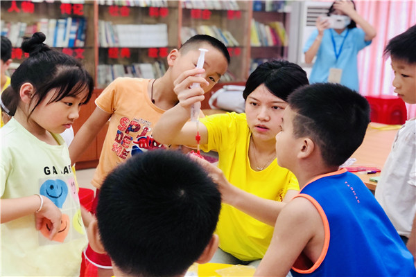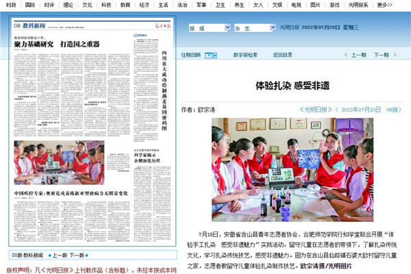 武汉大学工商管理专业学生刘欣同学参加了在阜阳市太和县城关镇复兴路社区开办的丹心向党行知学堂,参与学堂课程编排、联系课外教师等工作,邀请中国编制协会会员姚芳应邀来到学堂讲授《传统手工艺编织艺术》课程,同小学员们一同编制手工同心结、中国结等传统手工艺品。哈尔滨工业大学材料化学专业学生袁理同学、华南理工大学经济学专业赵梦琴同学参加安庆市潜山市源潭镇文化广播站开办的源潭行知学堂,分别教授《物理实验课》《化学实验课》和《党史宣讲》《课业辅导》等课程。内蒙古大学计算机科学与技术专业石晨旭同学在在亳州市谯城区五马镇芍花村的老大队部开办的行知成长行知学堂,承担《课外知识》《红色文化》《课业辅导》等课程教学。安徽大学历史学专业王雨欣、潘琪、陆明扬、王芷萱等同学参加了在宣城市绩溪县瀛洲龙川小学举办的绩溪瀛洲行知学堂,同我院“小先生”们一同策划了“印象绩溪”传承地域特色文化主题实践活动。鲁迅美术学院艺术设计学专业周昕怡同学参加了在阜阳市颍州区三塔镇三塔集兴轩托管中心开办的萤火虫行知学堂,教授或开展科普生活小常识、智力游戏、课外活动、一起包饺子等课程和活动。