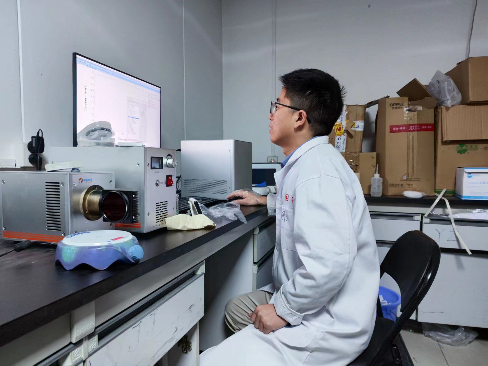 邵伟正在电化学工作站进行电化学测试