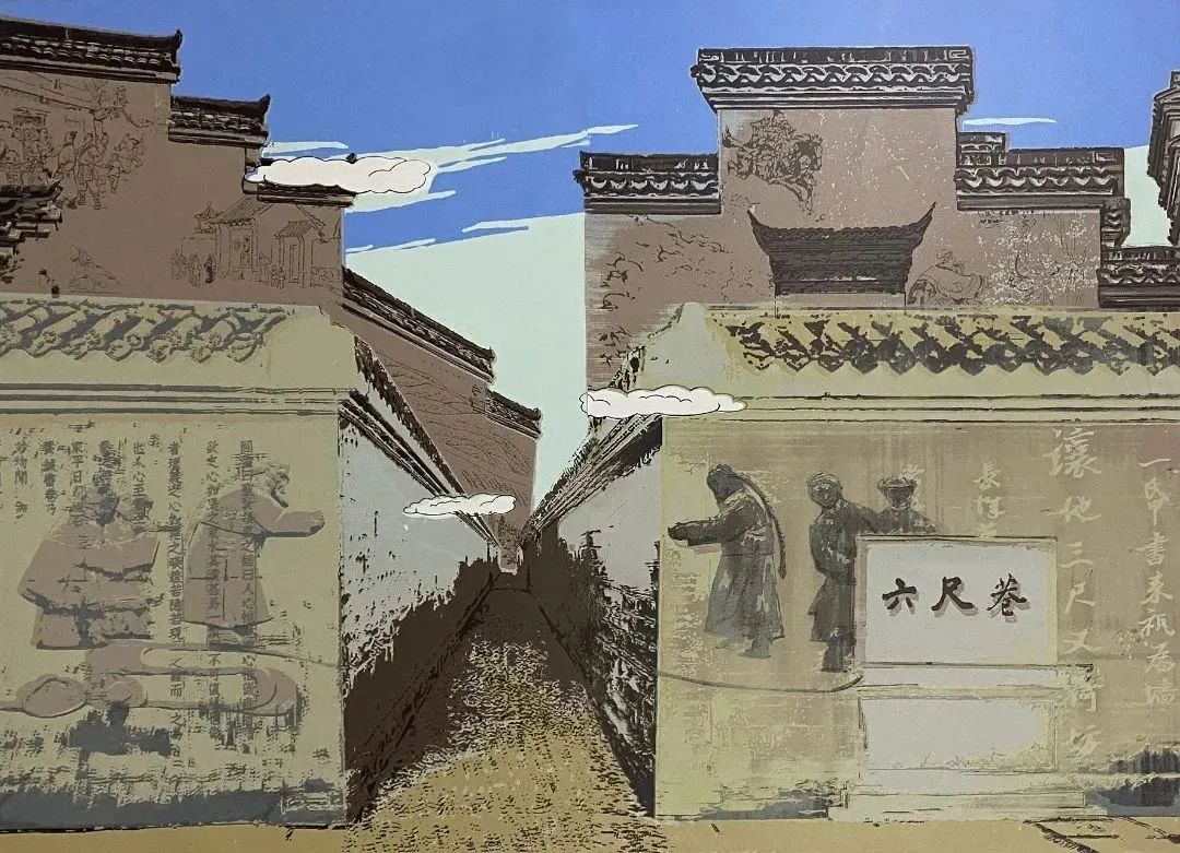 《六尺乾坤》是郭益徽派版画的得意之作。为表现六尺巷里“恭谦礼让”的处世哲学,她将建筑年代数据转化为精密网点,通过七层套色丝网叠印出时空交织的巷道图景。